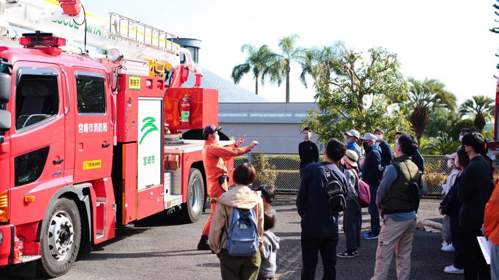 宮崎消防署の方に来ていただき、地震体験・AED講習・消防車見学を行いました。