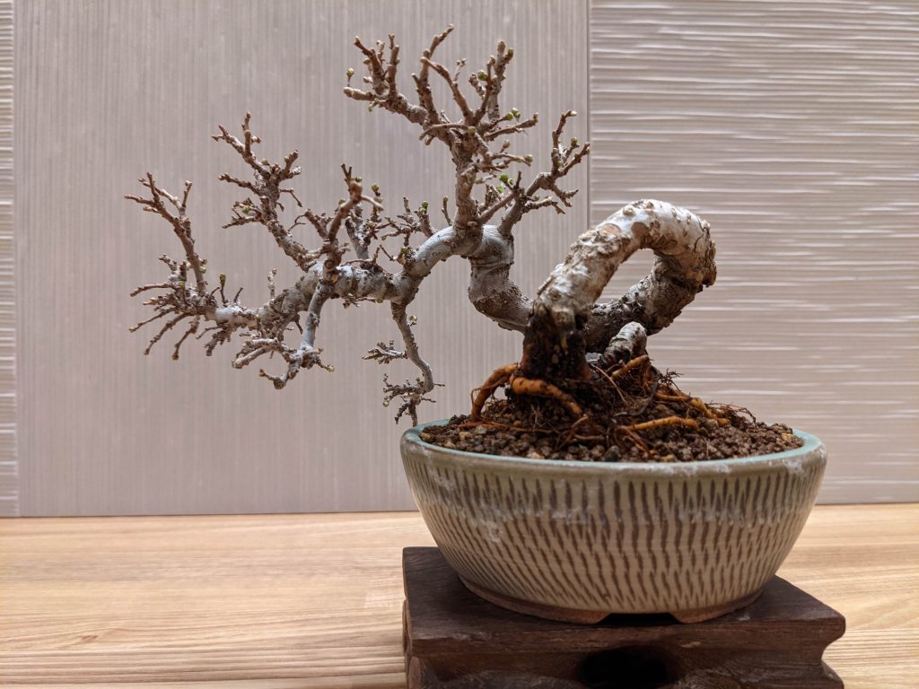 2つ目は、樹の足元の根張りです。小さい鉢の中で根が板のように広がる姿(根張りを作るにはとても時間がかかります)は非常に見応えがあります。